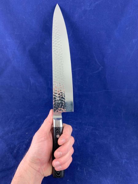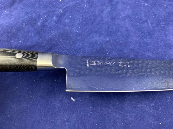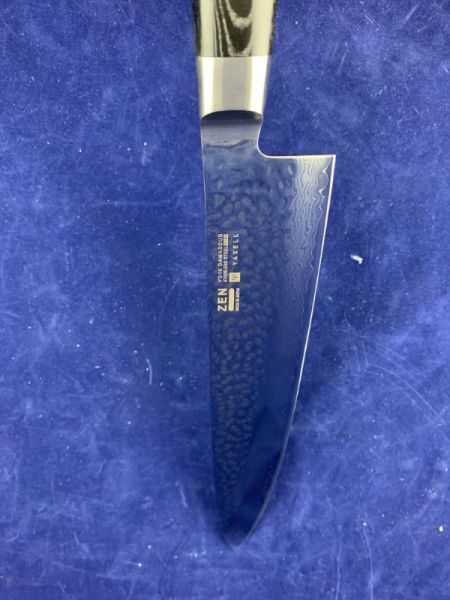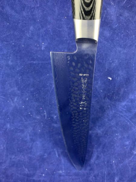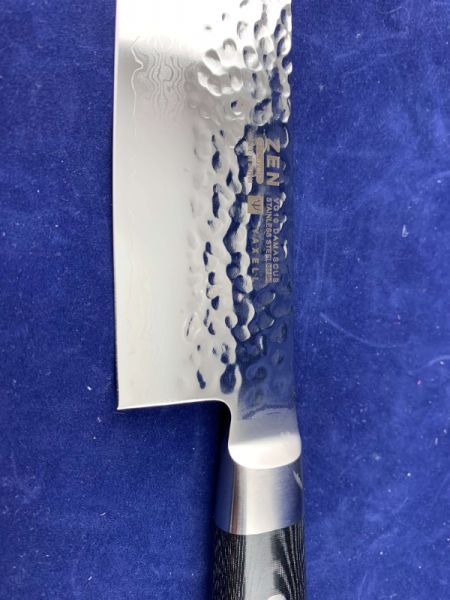 Основной материал из которго выполнен нож - VG10 (3 слоя - кобальт+молибден+ванадий) "супер нержавеющая сталь", который покрывает лезвие с обеих сторон 18 слоями мягкой и твердой высокоуглеродистой нержавеющей сталина каждой стороне, производя 37-слойное, устойчивое к ржавчине дамасское лезвие. Следы молотка на верхней части лезвия делают его очень оригинальным и художественным.