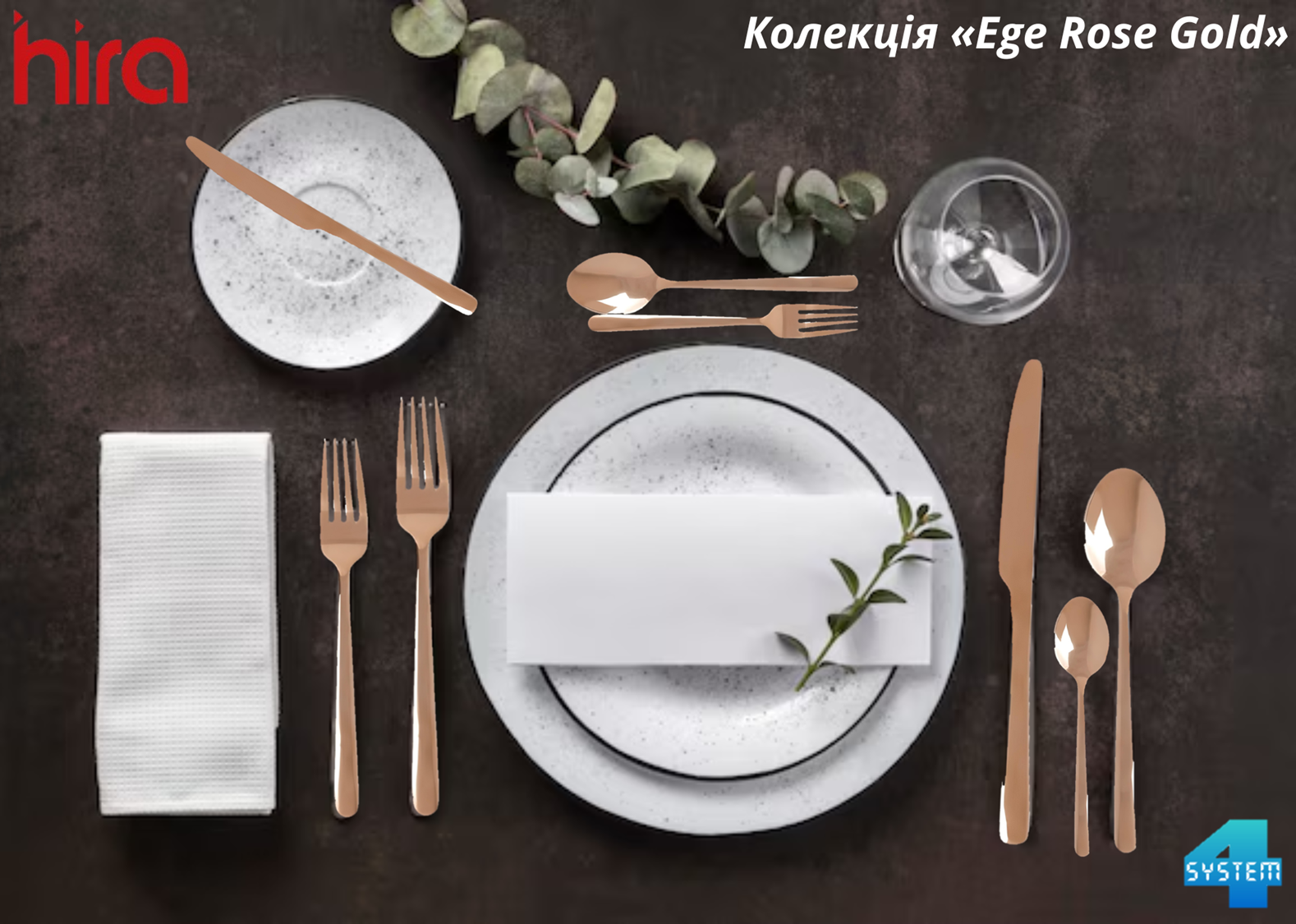 Коллекция Ege Rose Gold выполнена из высококачественной пищевой нержавеющей углеродистой стали 18/10 (содержание хрома – 18%,