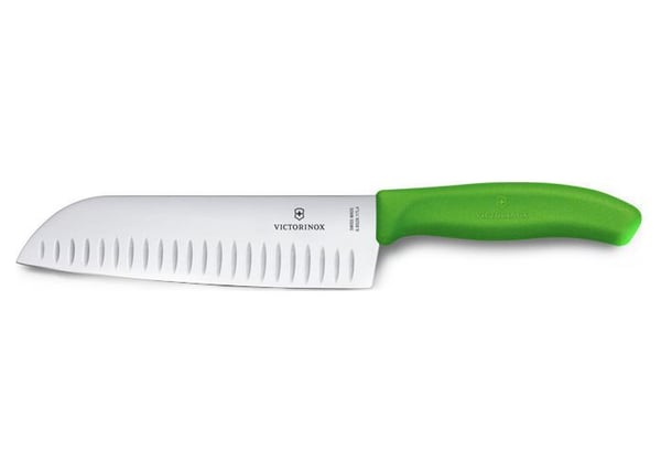 Швейцарский кухонный нож Victorinox относится к сегменту профессионального кухонного инвентаря для кафе и ресторанов. Основное предназначение кухонного ножа Santoku – нарезка разных видов продуктов. Нож идеально подойдет для нарезания ломтиками или кубиками овощей и мяса.