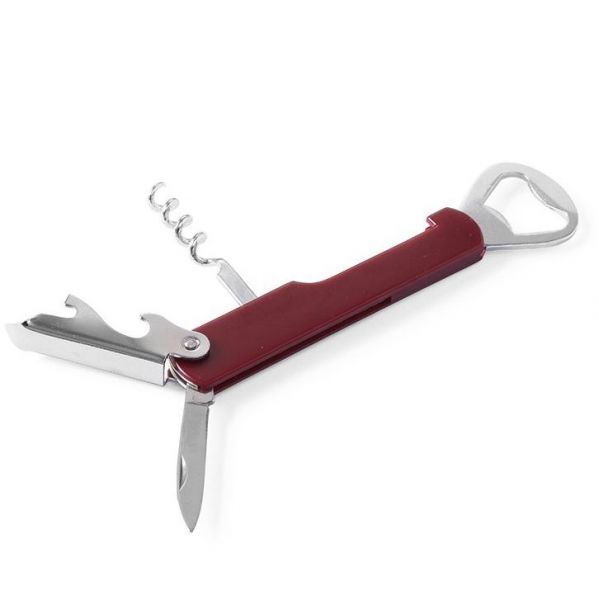 Открывалка выполнена из хромированной стали. Ручка из пластика. Открывалка состоит из 4 элементов.