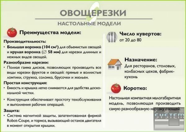 Robot Coupe - мировой лидер по продажам овощерезок и куттеров: компания специализируется в этой области и предлагает лучшее соотношение цены и качества.Овощерезки Robot Coupe давно известны всему миру своим качеством, надёжностью и долговечностью. А также самым большим разнообразием дисков для любых видов нарезки, которые так необходимы для современной профессиональной кухни. Их использование позволяет приготовить салаты, винегреты, фруктовые салаты и выполнить любую форму нарезки, необходимую для приготовления супов, гарниров, сладких блюд и украшений для них.