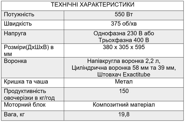 Цилиндрическая воронка (Ø 58 мм) предназначена для длинных или деликатных овощей (например, кабачков, огурцов, грибов) гарантирует исключительную точность нарезки.