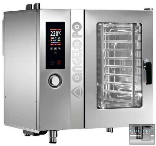 Пароконвектомат Angelo Po FX101G3R: Газовый нагрев. Реверсивное открытие двери - правосторонее. Вместимость - GN 1/1 х 10, противни 60х40 х 8. Условная производительность - 140 блюд. Топ модель - уровень 3.