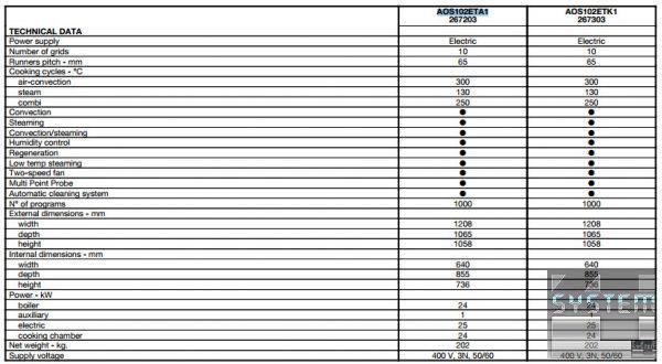 Пароконвектомат Electrolux AOS102ETA1 (артикул 267203) бойлерного типа на 10 GN2/1 гастроемкостей, бойлерного типа, программируемый, 3 способа приготовления (автоматический, через панель рецептов (1000шт. в 16 этапов), ручной). Полностью автоматическое приготовление (задается тип продукта и способ его обработки, вес, обьем и время приготовления определяется пароконвектоматом), при ручном методе и создании рецептов доступны такие режимы приготовления: конвекция (25-300°C), пар (100°C), низкотемпературный пар (25-99°C), перегретый пар (101-130°C), комбинированный, Eco-Delta, приготовление при низких температурах LTC, непосредственное отслеживание и контроль влажности в камере Air-o-Clima, автоматическая система мойки Air-o-Clean, вентилятор двойного действия, равномерное распределение горячего воздуха Air-o-Flow, сенсорная интерактивная панель управления, быстрое охлаждение камеры, ручной впрыск воды, функция мармита, мультизонный пробник-зонд, встроенный вытяжной душ, автоматическое определение отложений солей в бойлере, двойной стеклопакет двери, термостат, подсветка камеры, USB-порт, нерж. сталь. Пароконвекционная печь Electrolux 267203 прямоугольной формы с габаритными размерами: 1208мм (длина), 1065мм (глубина), 1058мм (высота) и весит 202кг. Аппарат питается от трехфазной сети мощностью 25кВт с напряжением 400В и частотой 50 Гц.