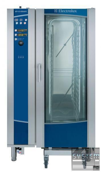 Пароконвектомат Electrolux AOS201EBA2 (артикул 268204) бойлерного типа на 20 GN1/1 гастроемкостей, режимы приготовления: конвекция (до 300°C), на пару (до 130°C), комбинированный (30-250°C, 0-90%), цикл регенерации, Eco-Delta, автоматическая система мойки Air-o-Clean, вентилятор двойного действия, равномерное распределение горячего воздуха Air-o-Flow, электронное управление, быстрое охлаждение камеры, ручной впрыск воды, функция мармита (так же позволяет готовить при низких температурах), однозонный пробник-зонд, автоматическое определение отложений солей в бойлере, двойной стеклопакет двери, термостат, подсветка камеры, в комплекте с тележкой, нерж. сталь. Пароконвекционная печь Electrolux 268204 прямоугольной формы с габаритными размерами: 993мм (длина), 957мм (глубина), 1795мм (высота) и весит 284кг. Аппарат питается от трехфазной сети мощностью 34,5кВт с напряжением 400В и частотой 50 Гц.