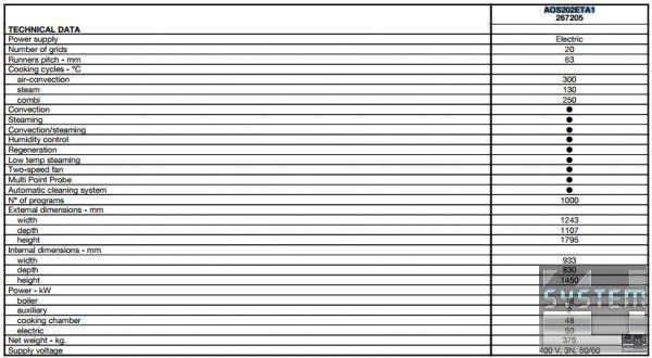 Пароконвектомат Electrolux AOS202ETA1 (артикул 267205) бойлерного типа на 20 GN2/1 гастроемкостей, бойлерного типа, программируемый, 3 способа приготовления (автоматический, через панель рецептов (1000шт. в 16 этапов), ручной). Полностью автоматическое приготовление (задается тип продукта и способ его обработки, вес, обьем и время приготовления определяется пароконвектоматом), при ручном методе и создании рецептов доступны такие режимы приготовления: конвекция (25-300°C), пар (100°C), низкотемпературный пар (25-99°C), перегретый пар (101-130°C), комбинированный, Eco-Delta, приготовление при низких температурах LTC, непосредственное отслеживание и контроль влажности в камере Air-o-Clima, автоматическая система мойки Air-o-Clean, вентилятор двойного действия, равномерное распределение горячего воздуха Air-o-Flow, сенсорная интерактивная панель управления, быстрое охлаждение камеры, ручной впрыск воды, функция мармита, мультизонный пробник-зонд, автоматическое определение отложений солей в бойлере, двойной стеклопакет двери, термостат, подсветка камеры, USB-порт, нерж. сталь. Пароконвекционная печь Electrolux 267205 AOS202ETA1 прямоугольной формы с габаритными размерами: 1243мм (длина), 1107мм (глубина), 1795мм (высота) и весит 375кг. Аппарат питается от трехфазной сети мощностью 50кВт с напряжением 400В и частотой 50 Гц.