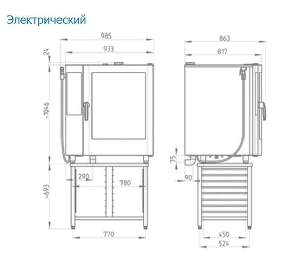 Размер гастроемкости - GN 1/1 (530x325 мм). Пароконвектомат может быть встроен в комплект с другой печью или регенератором (шкаф для хранения). Система генерации пара - инжекторная или на основе котла. Источником тепла является электричество или газ.
