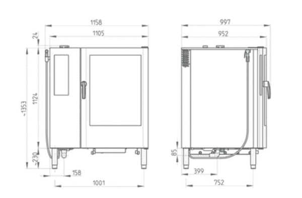 Размеры гастроемкости: GN 2/1 (650x530 мм) или GN 1/1 (530x325 мм). Основное оборудование этой пароконвектомата включает в себя тележку. Существует либо система впрыска, либо парогенератор котла. Источником тепла является электричество или газ.