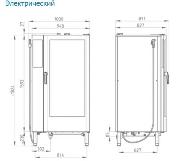Размеры гастроемкости: GN 1/1 (530x325 мм). Основное оборудование этой пароконвектомата включает в себя тележку. Существует либо система впрыска, либо парогенератор котла. Источником тепла является электричество или газ.