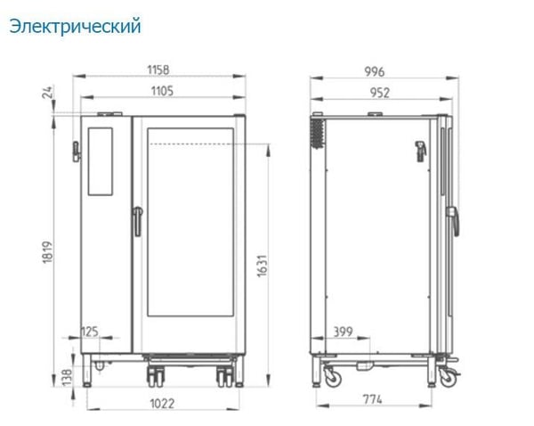 Размеры гастроемкости: GN 2/1 (650x530 мм). Основное оборудование этой пароконвектомата включает в себя тележку. Существует либо система впрыска, либо парогенератор котла. Источником тепла является электричество или газ.