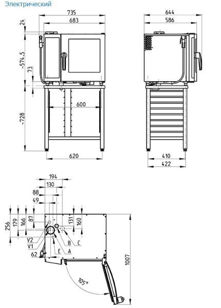 Размер гастроемкости - GN 2/3 (354x325 мм). Пароконвектомат может быть установлен на стандартной подставке, на настенной консоли или прямо на столе. Источником тепла является электричество.