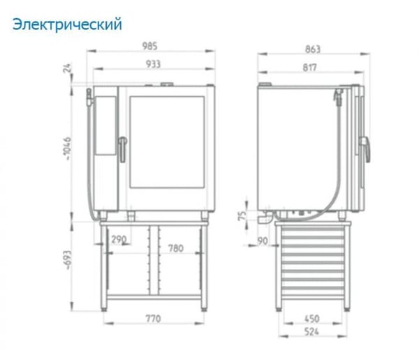 Размер гастроемкости - GN 1/1 (530x325 мм). Пароконвектомат может быть установлен на стандартной подставке, на настенной консоли или прямо на столе. Источником тепла является электричество.