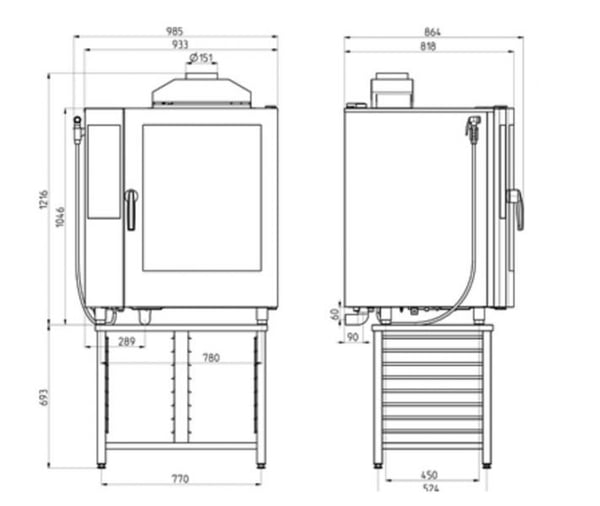 Размер гастроемкости - GN 1/1 (530x325 мм). Пароконвектомат может быть установлен на стандартной подставке, на настенной консоли или прямо на столе. Источником тепла является электричество.