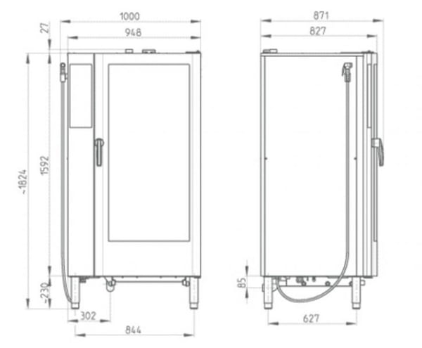 Размеры гастроемкости: GN 1/1 (530x325 мм). Основное оборудование этой пароконвектомата включает в себя тележку. Существует либо система впрыска, либо парогенератор котла. Источником тепла является электричество или газ.