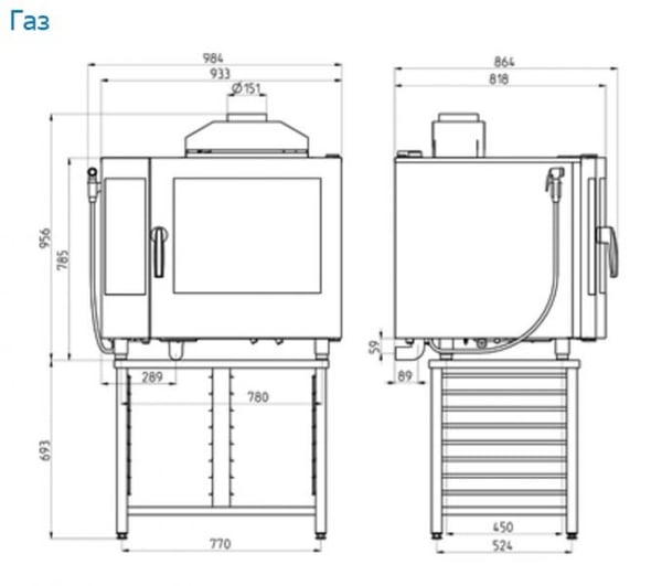 Управляемый аварийный клапан для сброса избыточного пара. Присутствуют полки для гастрономической посуды.