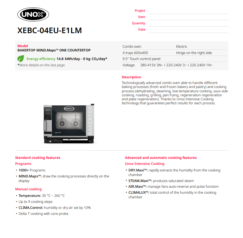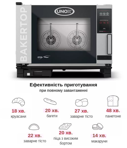 Пароконвекционная печь UNOX BAKERTOP MIND.Maps™ XEBC-04EU-E1RM — это интеллектуальная электрическая печь, созданая для совершенной выпечки. Благодаря инновационному контролю микроклимата, вы получаете идеальную структуру мякиша и безупречную золотистую корочку каждый раз. Сенсорный дисплей MASTER.Touch ONE на 9,5" позволяет програмировать циклы приготовления одним касанием, а функция раздельного приготовления блюд без смешивания ароматов максимизирует эффективность вашой кухни. Лучшее решение для мощных пекарен, кондитерских и супермаркетов.