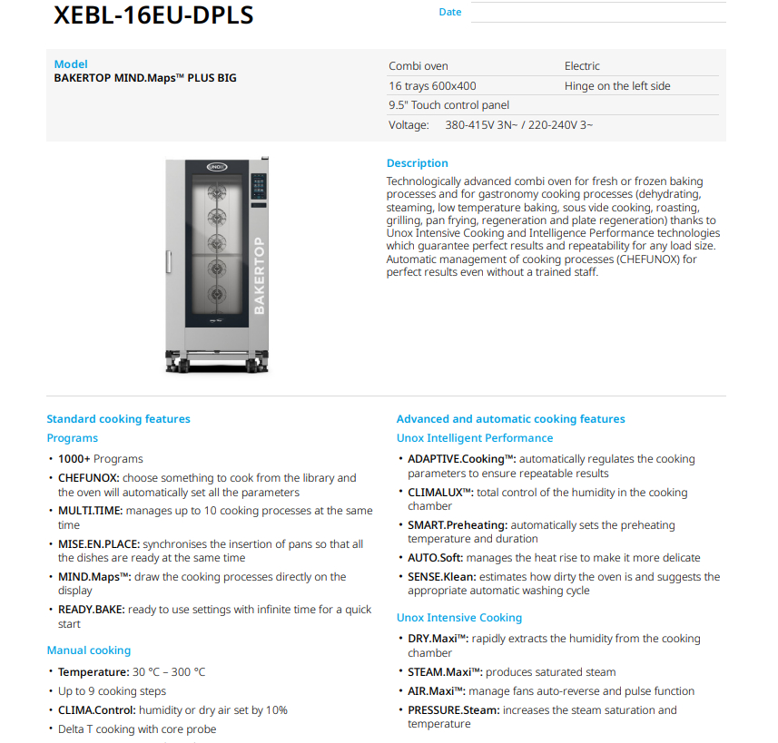 Пароконвекционная печь UNOX BAKERTOP MIND.Maps™ XEBL-16EU-DPLS — это интеллектуальная электрическая печь, созданая для совершенной выпечки. Благодаря инновационному контролю микроклимата, вы получаете идеальную структуру мякиша и безупречную золотистую корочку каждый раз. Сенсорный дисплей MASTER.Touch PLUS на 9,5" позволяет програмировать циклы приготовления одним касанием, а функция раздельного приготовления блюд без смешивания ароматов максимизирует эффективность вашой кухни. Лучшее решение для мощных пекарен, кондитерских и супермаркетов.