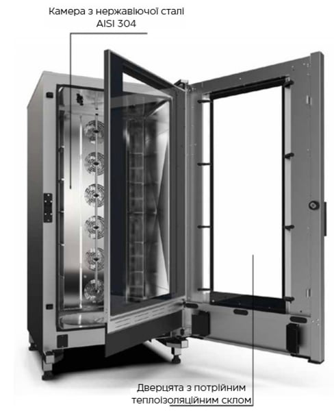 • Protek.SAFE™ - качественная теплоизоляция и максимальная безопасность. Надежная теплоизоляция обеспечивает максимальную эффективность печи. Охлаждение внешних поверхностей и стекла дверей для безопасной и комфортной работы с оборудованием.