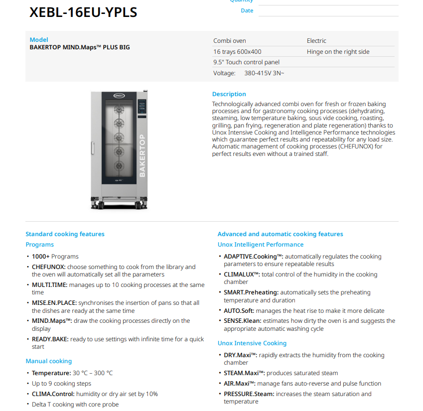 Пароконвекционная печь UNOX BAKERTOP MIND.Maps™ XEBL-16EU-YPLS — это интеллектуальная электрическая печь, созданая для совершенной выпечки. Благодаря инновационному контролю микроклимата, вы получаете идеальную структуру мякиша и безупречную золотистую корочку каждый раз. Сенсорный дисплей MASTER.Touch PLUS на 9,5" позволяет програмировать циклы приготовления одним касанием, а функция раздельного приготовления блюд без смешивания ароматов максимизирует эффективность вашой кухни. Лучшее решение для мощных пекарен, кондитерских и супермаркетов.