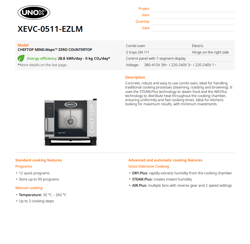 Пароконвекционная печь UNOX CHEFTOP MIND.Maps™ XEVC-0511-EZLM — это профессиональный пароконвектомат, спроектированный как надежный инструмент для интенсивной ежедневной эксплуатации в заведениях общественного питания. Концепция модели базируется на принципе технической целесообразности: аппарат обеспечивает полный функциональный цикл приготовления без чрезмерных электронных систем и дорогостоящих опций. Лаконичная и понятная электронная панель управления гарантирует точность настроек и быстрый доступ к ключовым режимам. Это эффективное решение для профессиональной кухни, где приоритетом является выносливость оборудования, стабильность результата и быстрая окупаемость инвестиций благодаря отсутствию переплат за излишний функционал.