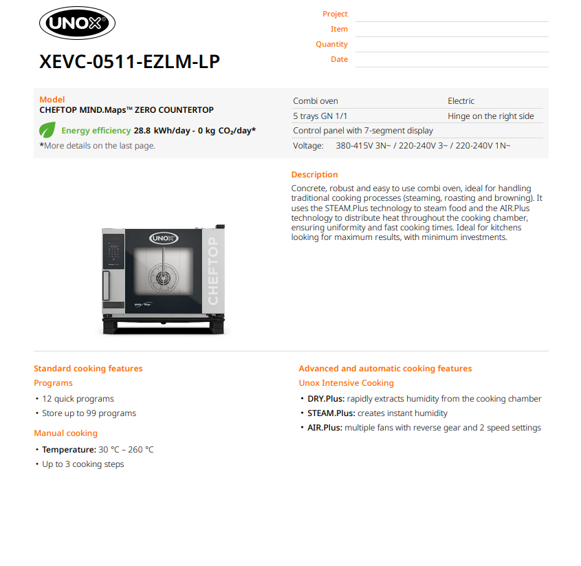 Пароконвекционная печь UNOX CHEFTOP MIND.Maps™ XEVC-0511-EZLM-LP — это профессиональный пароконвектомат, спроектированный как надежный инструмент для интенсивной ежедневной эксплуатации в заведениях общественного питания. Концепция модели базируется на принципе технической целесообразности: аппарат обеспечивает полный функциональный цикл приготовления без чрезмерных электронных систем и дорогостоящих опций. Лаконичная и понятная электронная панель управления гарантирует точность настроек и быстрый доступ к ключовым режимам. Это эффективное решение для профессиональной кухни, где приоритетом является выносливость оборудования, стабильность результата и быстрая окупаемость инвестиций благодаря отсутствию переплат за излишний функционал.