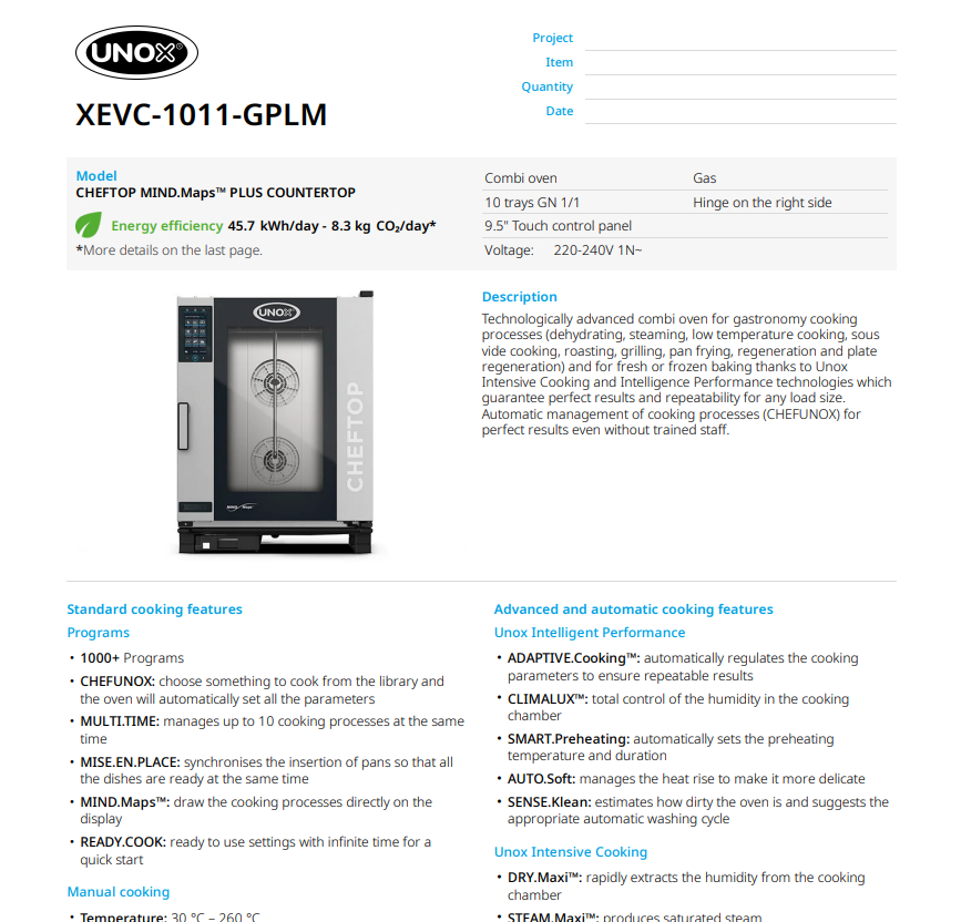 Пароконвекционная печь UNOX CHEFTOP MIND.Maps™ XEVC-1011-GPLM — это технологический прорыв в сфере профессионального теплового оборудования, воплощающий многолетний опыт мирового лидера отрасли. Серия CHEFTOP была создана специально для шеф-поваров и рестораторов, которые не готовы к компромиссам между творческой свободой и строгим контролем качества. Благодаря интеллектуальным системам управления, эти печи гарантируют абсолютную повторяемость результата: каждое блюдо будет идеальным, независимо от того, кто сегодня стоит на смене.