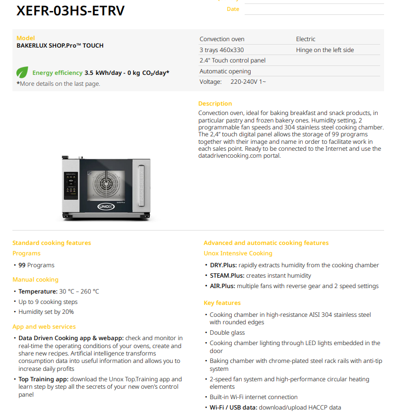 Электрическая конвекционная печь UNOX XEFR-03HS-ETRV Stefania.Matic входит в линейку печей для выпечки хлебобулочных и кондитерских изделий BakerLux Shop.Pro. Это идеальная печь для небольших кафе, кафеен, мини-пекарен и пекарских зон при автозаправочных станциях.