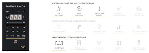 Простая в использовании панель управления GO позволяет самостоятельно регулировать температуру и время выпекании, а встроенная память на 99 программ обеспечивает максимально стабильный результат для каждого изделия.
