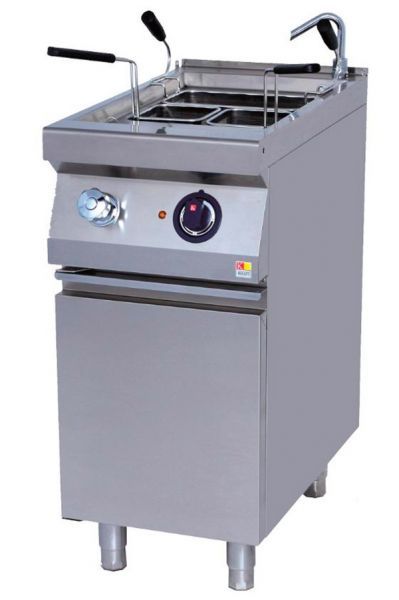 Напольная электрическая пастоварка оснащена одной ванной, в которую помещается сетчатая корзина для отваривания, наполненная водой, которая снабжена термоустойчивой пластиковой ручкой. Корзина может быть поделена на несколько отделений-секций, что позволяет готовить одновременно разные виды тестовых изделий.