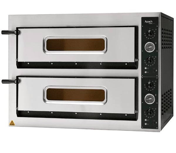 Двухкамерная печь для пиццы Apach АML4 снабжена двумя термостатами, регулирующими температуру внутри камеры, мощными нагревательными элементами в верхней и нижней частях камеры.