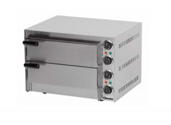 Двуъкамерная печь выполнена из высококачественной нержавеющей стали, имеет систему быстрого нагрева и приготовления, обеспечивается равномерный нагрев продукта за счет выпекания камня и есть возможность выпекать мучные изделия. Духовка контролируется термостатами.