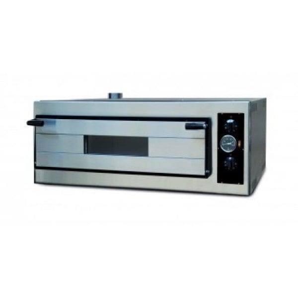 В течение 4 минут, можно приготовить шесть румяных пицц или лепешек диаметром 30 см. Оборудование оснащено задней трубой для выхода пара, поэтому необходимо помнить, что не нужно придвигать печь вплотную к стене и не закрывать трубу. Раздельное регулирование температуры верхней и нижней зоны тепловой камеры. Дверью с двойным закаленным стеклом, что позволяет следить за ходом готовки, внутренней подсветкой камеры и два термостата с контрольными лампами. Дно камеры выложено огнеупорным камнем, благодаря этому выпечка пропекается равномерно до хрустящей корочки. Корпус выполнен из окрашенной стали, камера и фасад печи изготовлен из нержавеющей стали. Рабочая температура от +50...+450 °С. Мощность печи 6,0кВт. Достигает максимальной температуры за 15 мин.