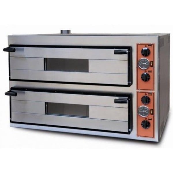 В течение 4 минут, можно приготовить двенадцать румяных пицц или лепешек диаметром 34 см. Оборудование оснащено задней трубой для выхода пара, поэтому необходимо помнить, что не нужно придвигать печь вплотную к стене и не закрывать трубу. Раздельное регулирование температуры верхней и нижней зоны тепловой камеры. Дверью с двойным закаленным стеклом, что позволяет следить за ходом готовки, внутренней подсветкой камеры и четыри термостата с контрольными лампами. Дно камеры выложено огнеупорным камнем, благодаря этому выпечка пропекается равномерно до хрустящей корочки. Корпус выполнен из окрашенной стали, камера и фасад печи изготовлен из нержавеющей стали. Рабочая температура от +50...+450 °С. Мощность печи 14,4кВт. Достигает максимальной температуры за 15 мин.