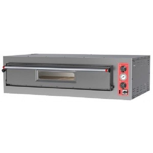 В течение 4 минут, можно приготовить девять румяных пицц или лепешек диаметром 34 см. Оборудование оснащено задней трубой для выхода пара, поэтому необходимо помнить, что не нужно придвигать печь вплотную к стене и не закрывать трубу. Раздельное регулирование температуры верхней и нижней зоны тепловой камеры. Дверь со смотровым окном из закаленного двойного стекла,что позволяет следить за ходом готовки, внутренней подсветкой камеры и два термостата с контрольными лампами. Дно камеры выложено огнеупорным камнем, благодаря этому выпечка пропекается равномерно до хрустящей корочки. Корпус выполнен из окрашенной стали, камера и фасад печи изготовлен из нержавеющей стали. Рабочая температура от +50...+450 °С. Мощность печи 12,9кВт. Достигает максимальной температуры за 15 мин.