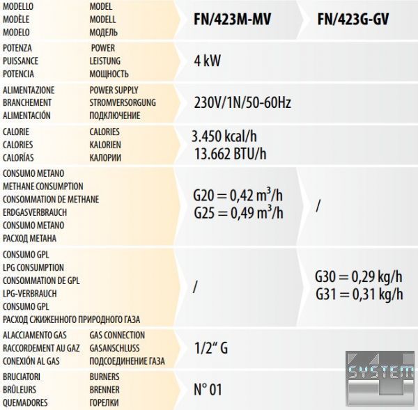 FN423M/MV-G/GV: Вместимость 4 GN2/3 с шагом 75 мм, 1 центробежный вентилятор, автоматический увлажнитель с регулятором мощности для
