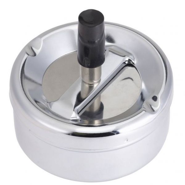 Пепельница изготовлена из высококачественной нержавеющей стали с кнопкой, по окантовке есть выемки для сигарет.