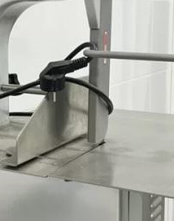 Пила для мяса безопасна в эксплуатации благодаря наличию аварийной кнопки, микровыключателя на крышке пилы и механического толкателя для мяса.