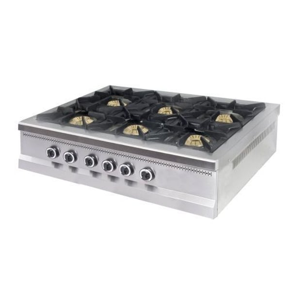 Плита 6х конфорочная настольная. Корпус плиты и основные рабочие элементы изготовлены из пищевой нержавеющей стали и чугуна.
