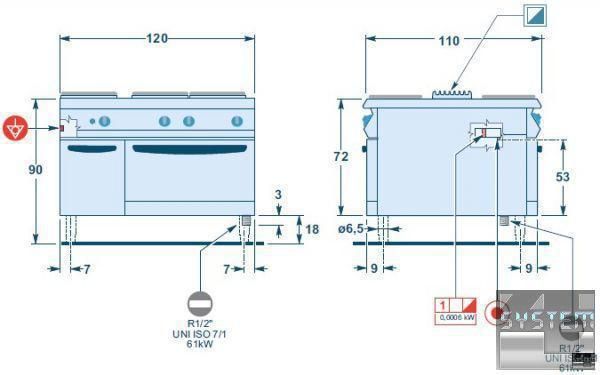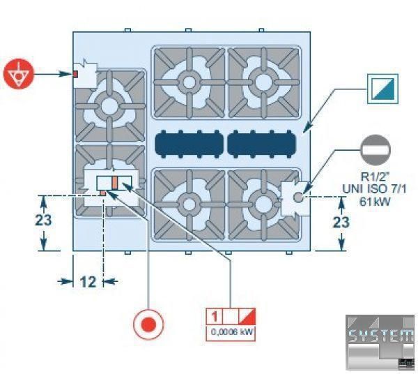 Открытые горелки имеют двойную корону огня, три из них мощностью 7 кВт (диаметр 110 мм) и три - 10 кВт (диаметр 130 мм).