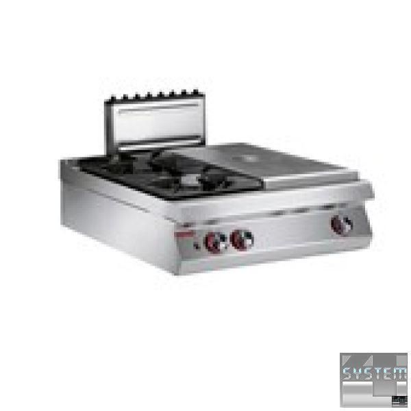 Плита газовая, открытая, настольная на 2 горелки и гладкую поверхность справа, мощностью одна горелка на 7 кВт ( диаметр 110 мм с "двойной короной" ), одна горелка на 10 кВт (130 мм с "двойной короной") и гладкая поверхность мощностью 7 кВт без духового шкафа - функциональный элемент линии Alpha 900. Горелки водонепроницаемы и прессформированы. Термостатический клапан с пилотом, термопарой и пьезоэлектрическим воспламенением. Перед покупкой необходимо уточнить тип газа для конкретного экземпляра плиты. Подставка поставляется отдельно. Материал корпуса – нержавеющая сталь AISI 304 толщиной 2 мм, горелки из чугуна, благодаря чему достигнута безпрецендентная прочность и жесткость всей конструкции, обеспечивающая долговечность эксплуатации. Возможность компоновки с газовой или электрической статистической духовкой, снабженной новой безотказной электронной системой зажигания, мощной теплоизоляцией. Внутренний размер позволяет использовать стандартные емкости и решетки форматом GN2/1. Духовка полностью из нержавеющей стали AISI 430 со съемными направляющими. Три положения противня по высоте духовки.