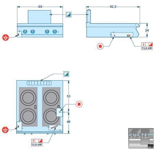 Четыре независимые нагревательные зоны мощностью от 1,5 кВт до 3,4 кВт каждая, диаметром от 19,5 см до 27 см каждая.