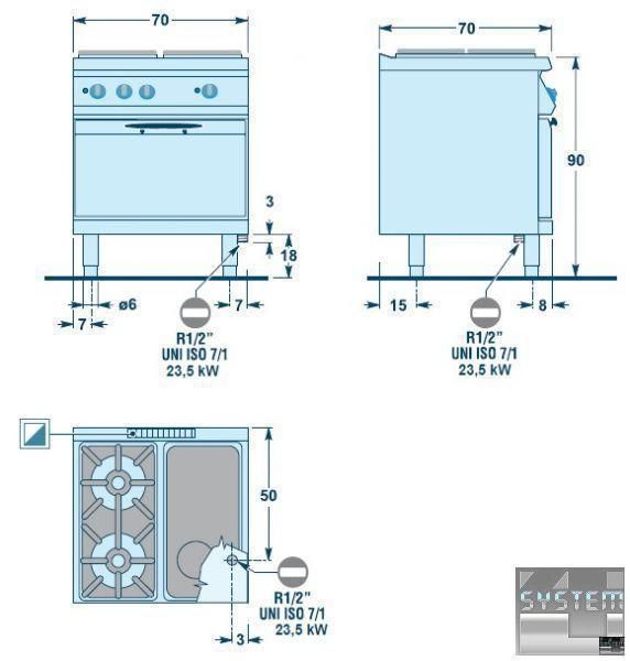 Духовые шкафы изготавливаются из полированной нержавеющей стали AISI 430. Они комплектуются тремя направляющими для гастроемкостей, которые могут устанавливаться в трех разных положениях. Данная плита оснащена статической печью вместимостью 2/1 GN.