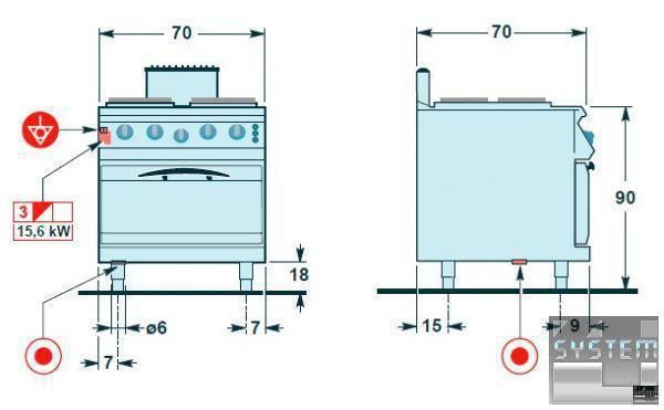 Плиты оборудованы 4 квадратными электрическими конфорками, каждая из которых мощностью 2,6 кВт (227 х 227 мм), сделанными из чугуна с термостатом безопасности.