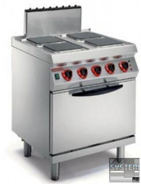 Электрическая плита с четырьмя квадратными конфорками и электрическим конвекционным духовым шкафом, вместимостью 1/1 GN Angelo Po 1G1PE2EV относится к тепловой модульной линии GAMMA 700.
