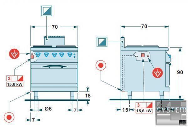 Плиты оборудованы 4 квадратными электрическими конфорками, каждая из которых мощностью 2,6 кВт (227 х 227 мм), сделанными из чугуна с термостатом безопасности.