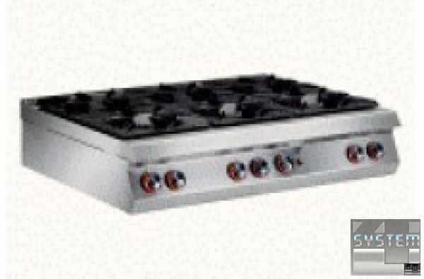 Плита газовая, открытая, настольная на 6 горелок, общей мощностью 48 кВт: одна горелка на 4 кВт на (диаметр 80 мм, однорядное пламя), 2 горелки по 7 кВт (диаметр 110 мм, с "двойной короной") и 3 горелки по 10 кВт ( диаметр 130 мм, с "двойной короной" ), без духового шкафа - функциональный элемент линии Alpha 900. Горелки водонепроницаемы и прессформированы. Термостатический клапан с пилотом, термопарой и пьезоэлектрическим воспламенением. Перед покупкой необходимо уточнить тип газа для конкретного экземпляра плиты. Подставка поставляется отдельно. Материал корпуса – нержавеющая сталь AISI 304 толщиной 2 мм, горелки из чугуна, благодаря чему достигнута безпрецендентная прочность и жесткость всей конструкции, обеспечивающая долговечность эксплуатации. Возможность компоновки с газовой или электрической статистической духовкой, снабженной новой безотказной электронной системой зажигания, мощной теплоизоляцией. Внутренний размер позволяет использовать стандартные емкости и решетки форматом GN2/1. Духовка полностью из нержавеющей стали AISI 430 со съемными направляющими. Три положения противня по высоте духовки.
