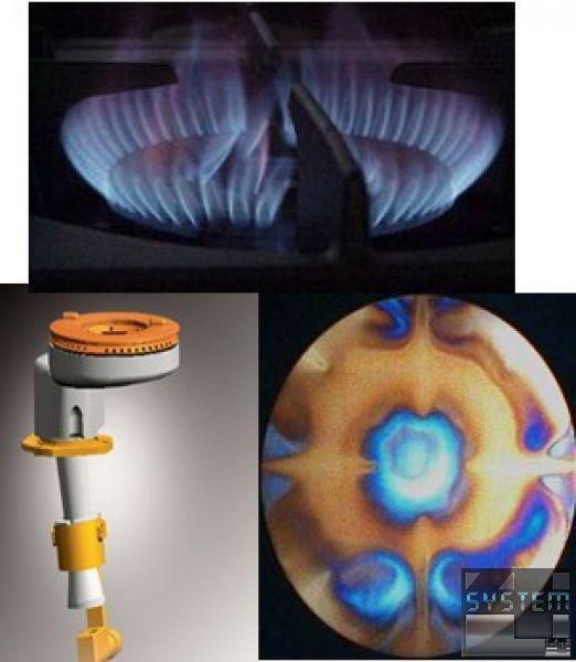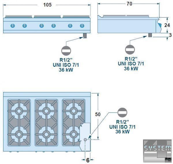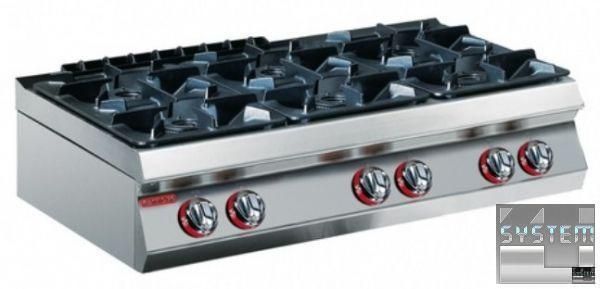 Все 6 открытых горелок имеют мощность по 6 кВт каждая (диаметр 110 мм) с двойной короной огня, а максимальная температура нагрева - 400°C.