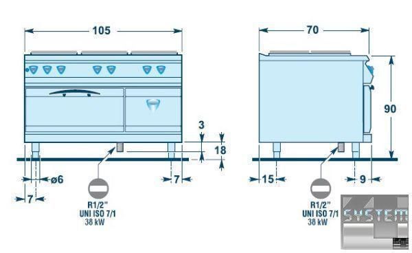 Духовые шкафы изготавливаются из полированной нержавеющей стали AISI 430. Они комплектуются тремя направляющими для гастроемкостей, которые могут устанавливаться в трех разных положениях. Данная плита оснащена статической печью вместимостью 2/1 GN.