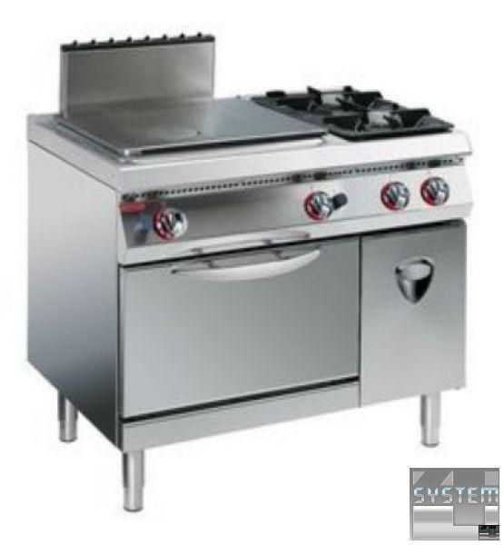 Нагревание духового шкафа посредством газовой горелки мощностью 4,5 кВт. Горелкой управляет термостатический клапан с пилотом, термопарой и пьезоэлектрическим воспламенением. Контролер температуры приготовления от 160°C до 280°C.