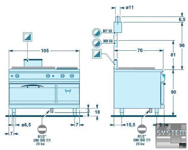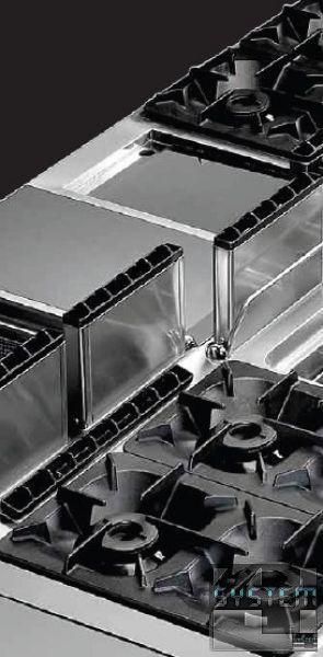 Духовые шкафы изготавливаются из полированной нержавеющей стали AISI 430. Они комплектуются тремя направляющими для гастроемкостей, которые могут устанавливаться в трех разных положениях. Данная плита оснащена статической печью вместимостью 2/1 GN.